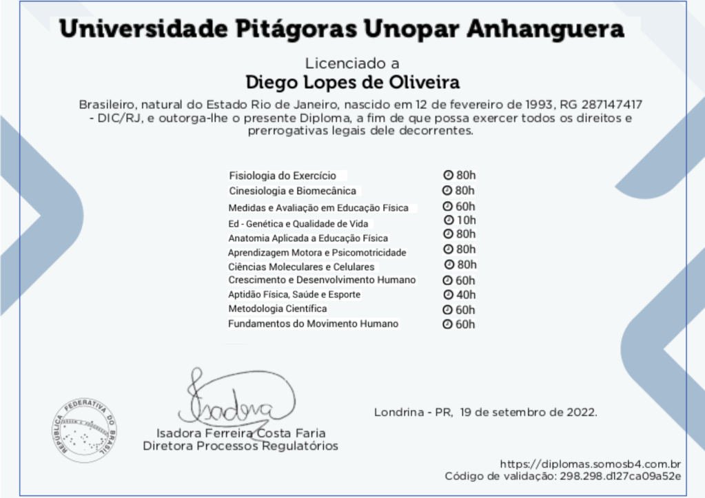 - Formado em 2022 pela universidade Pitágoras em Educação Física por amor, sempre fui fascinado pelo funcionamento do corpo, sua anatomia, fisiologia e bioquímica. Minha maior felicidade e satisfação como profissional da área da saúde é acompanhar e participar no desenvolvimento de cada aluno, seus resultados e seus objetivos.